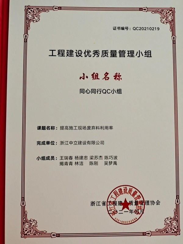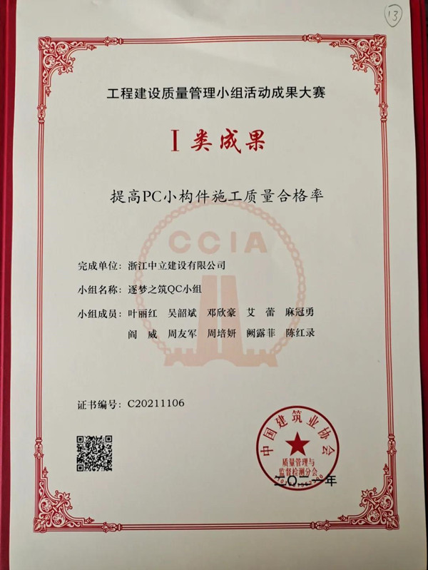 近日,從中建協傳來喜訊,中立公司逐夢之筑QC小組獲工程建設質量管理小組活動成果大賽Ⅰ類成果。今年我公司QC成果取得豐碩成績,另外樹人之心QC小組獲得浙江省優(yōu)秀QC成果一等獎1項、同心同行QC小組獲浙江省優(yōu)秀質量管理小組。
