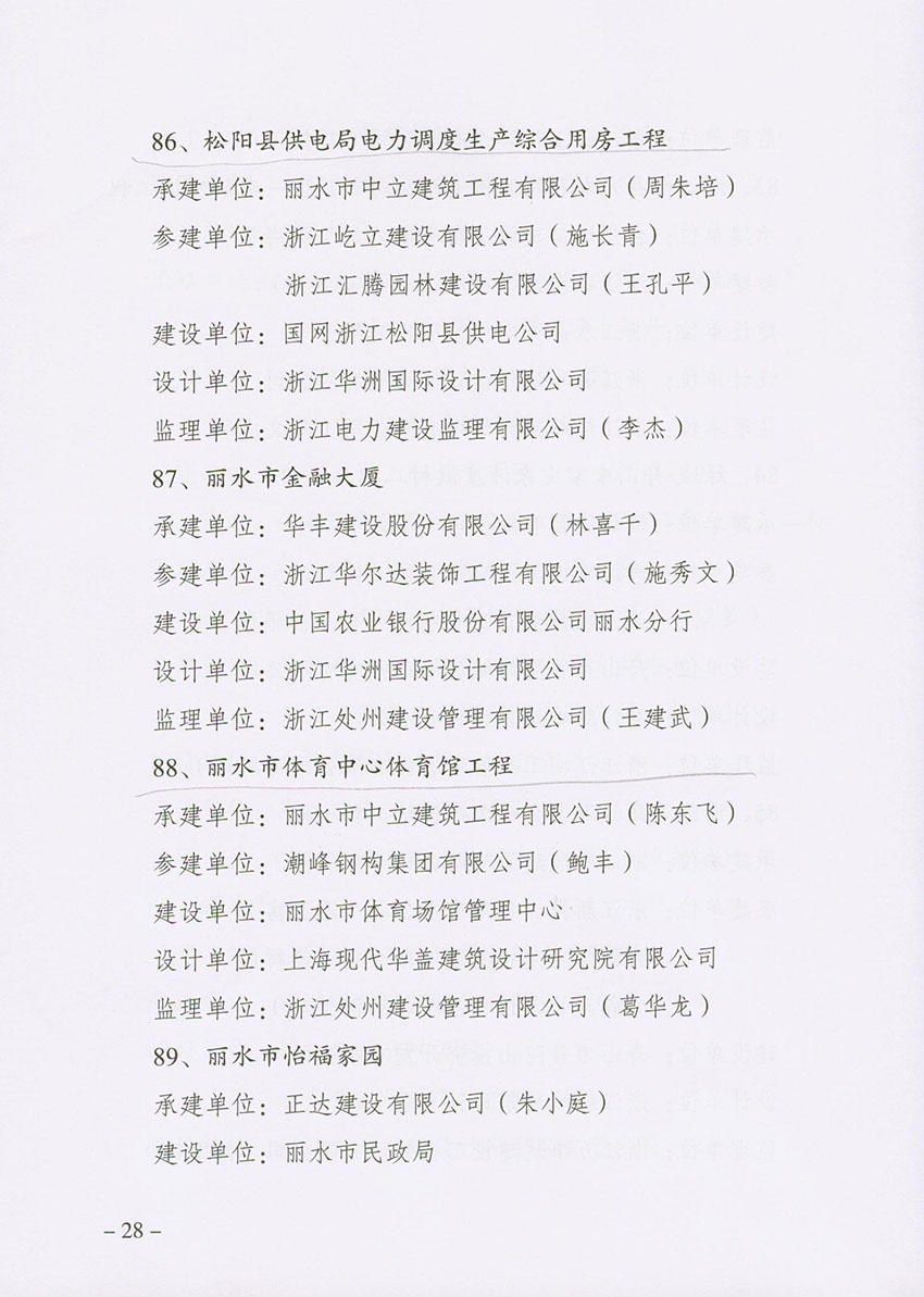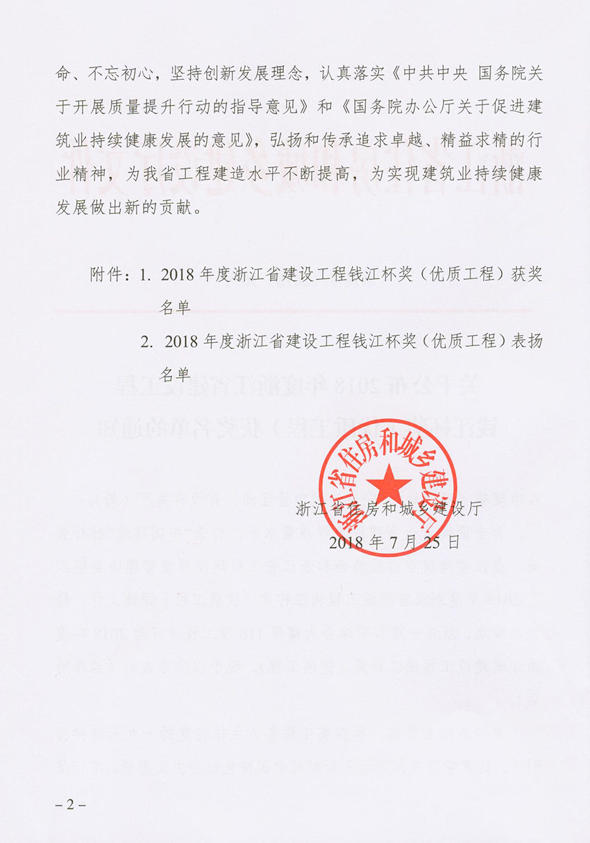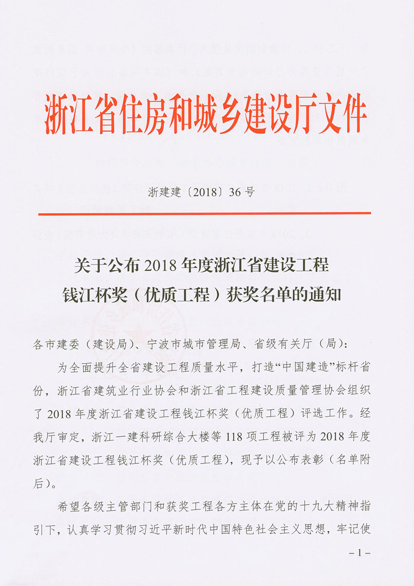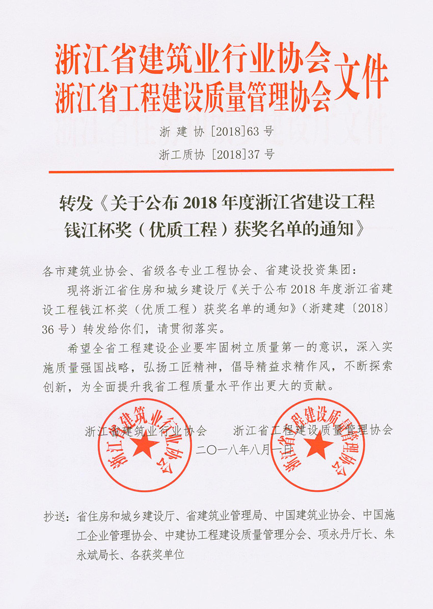 喜報(bào)!近日,省建設(shè)廳頒發(fā)了2018年度浙江省建設(shè)工程“錢江杯”(優(yōu)質(zhì)工程)文件,我公司“麗水市體育館體育中心工程、松陽縣供電局電力調(diào)度生產(chǎn)綜合用房工程”分別獲得2018年度“錢江杯”(優(yōu)質(zhì)工程)獎(jiǎng)。