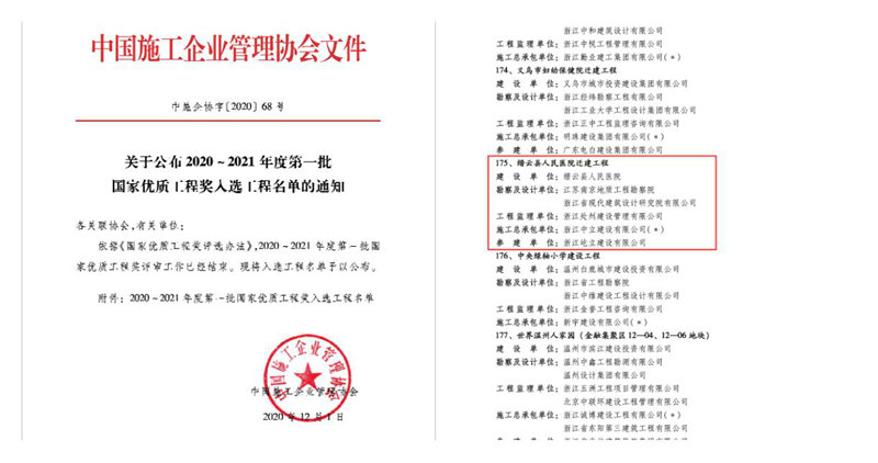 12月1日,中國施工企業(yè)管理協(xié)會公布了2020~2021年度第一批國家優(yōu)質(zhì)工程獎入選工程名單,中立建設(shè)承建的縉云縣人民醫(yī)院遷建工程榜上有名。這是公司獲得的第一個國家優(yōu)質(zhì)工程獎項目,也是麗水市本地企業(yè)第一個獲國家優(yōu)質(zhì)工程獎項目。